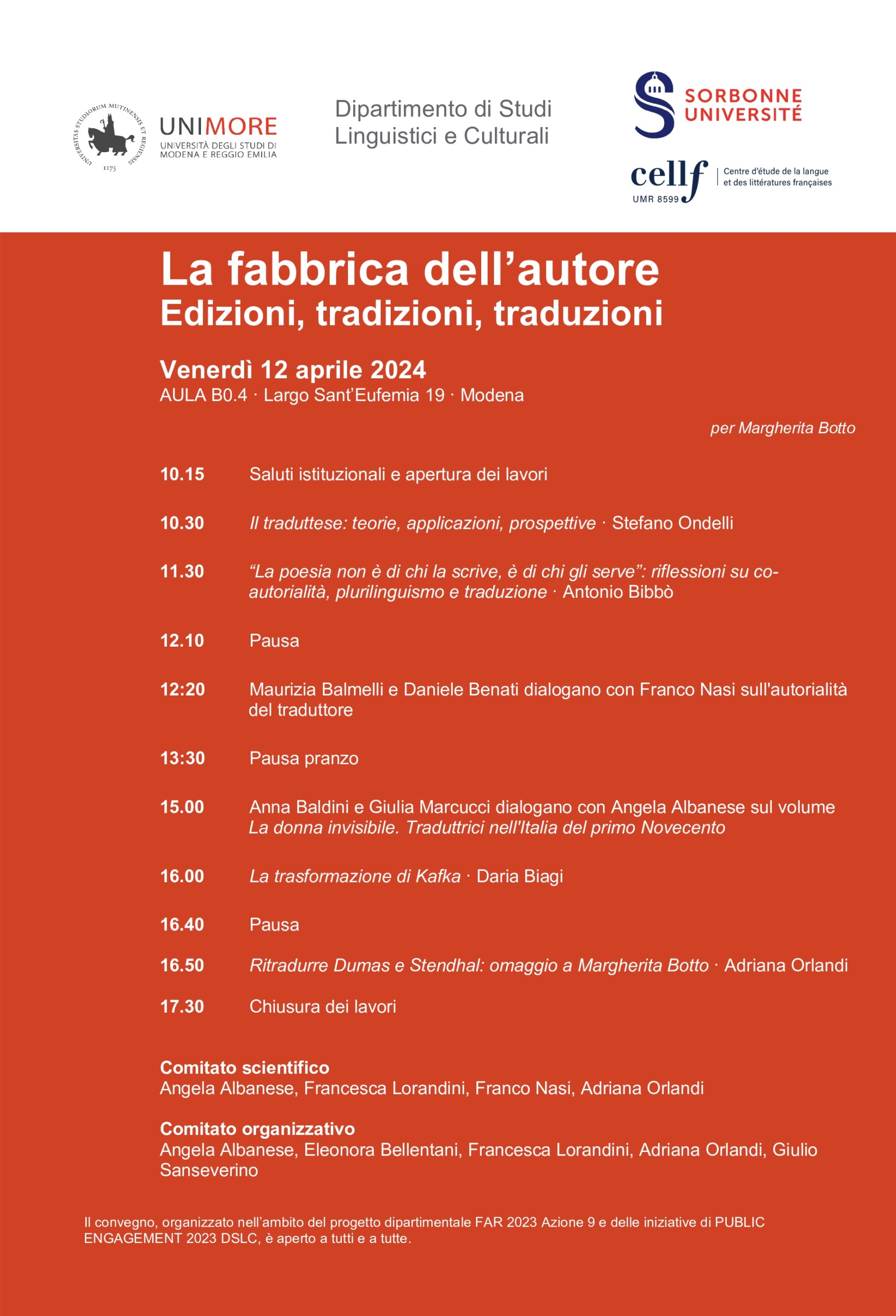 Anna Baldini e Giulia Marcucci dialogano con Angela Albanese sul volume "La donna invisibile. Traduttrici nell’Italia del primo Novecento" nell'ambito del convegno della rivista ri.tra "La fabbrica dell'autore. Edizioni, tradizioni, traduzioni", che si tiene a Modena il 12 aprile 2024. Gli altri interventi: - Il traduttese: teorie, applicazioni, prospettive · Stefano Ondelli - “La poesia non è di chi la scrive, è di chi gli serve”: riflessioni su coautorialità, plurilinguismo e traduzione · Antonio Bibbò - Maurizia Balmelli e Daniele Benati dialogano con Franco Nasi sull’autorialità del traduttore - La trasformazione di Kafka · Daria Biagi - Ritradurre Dumas e Stendhal: omaggio a Margherita Botto · Adriana Orlandi Comitato scientifico: Angela Albanese, Francesca Lorandini, Franco Nasi, Adriana Orlandi Comitato organizzativo: Angela Albanese, Eleonora Bellentani, Francesca Lorandini, Adriana Orlandi, Giulio Sanseverino