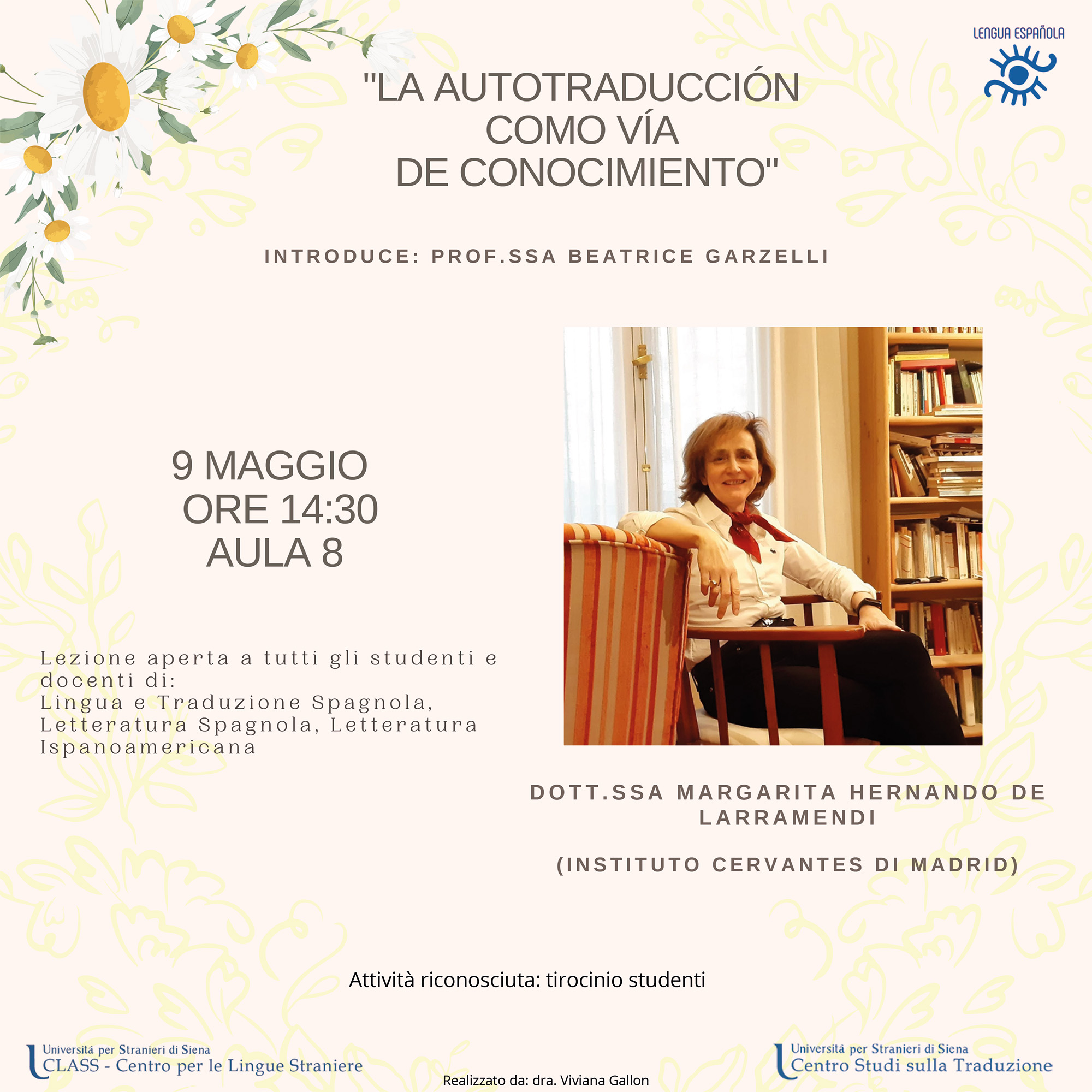 Il giorno 9 maggio 2025, alle ore 14,30 in aula 8, Margarita Hernando de Larramendi dell’Instituto Cervantes di Madrid terrà una lezione dal titolo La autotraducción como vía de conocimento. Introduce e coordina la Prof.ssa Beatrice Garzelli. L’attività sarà riconosciuta come tirocinio studenti.La lezione, aperta a tutti gli studenti e docenti di Lingua e traduzione spagnola, letteratura spagnola e letteratura ispanoamericana, è organizzata dal Centro per le lingue straniere CLASS insieme al Centro Studi per la Traduzione CeST.