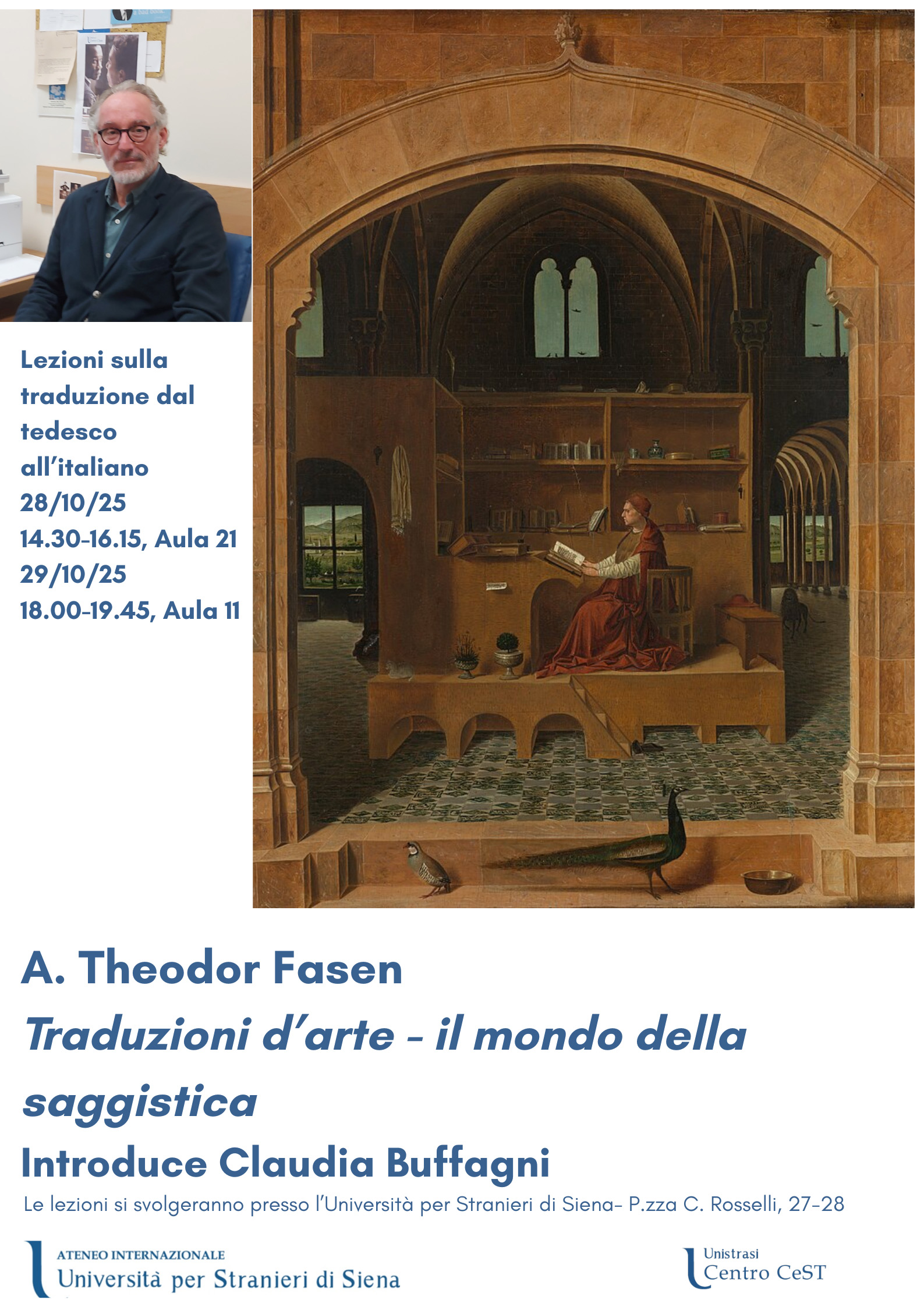 Il dott. A. Theodor Fasen terrà due lezioni laboratoriali sulla traduzione della saggistica d’arte per la coppia tedesco-italiano per gli studenti dell’Università per stranieri di Siena.
