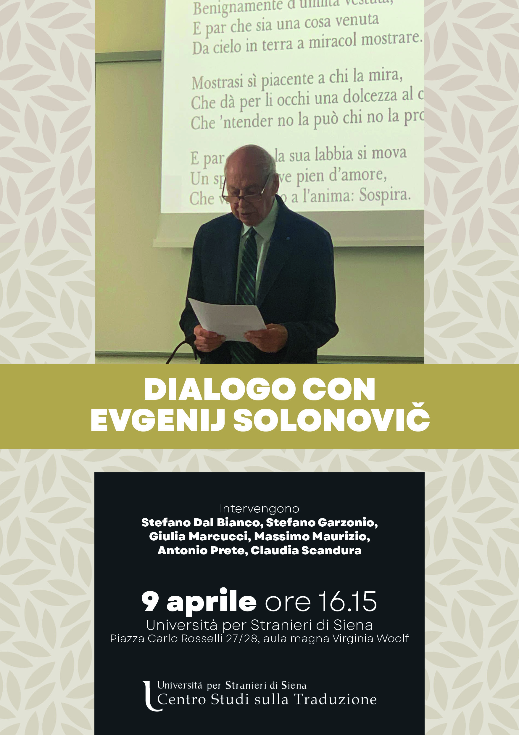 Il 9 aprile alle 16.00 si svolgerà l’incontro con il traduttore Evgenij Solonovič, al quale parteciparanno Stefano Dal Bianco, Stefano Garzonio, Giulia Marcucci, Massimo Maurizio, Antonio Prete e Claudia Scandura. Il dialogo sarà un’occasione per presentare il numero 3 del 2023 (XXXII) della rivista «Slavia» interamente dedicato a Evgenij Solonovič. Il numero contiene saggi, variazioni poetiche, ricordi, anneddoti e interviste al traduttore.
