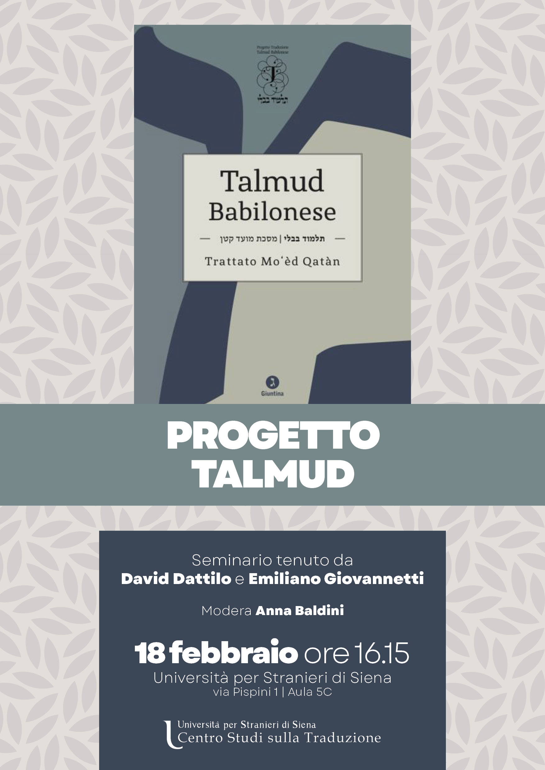 Il “Progetto Traduzione Talmud Babilonese”, finanziato dal Ministero dell’Università e della Ricerca in collaborazione con il CNR e l’Unione delle Comunità Ebraiche italiane, ha come obiettivo la traduzione digitalizzata in lingua italiana del Talmud Babilonese, un testo fondamentale della cultura ebraica non solo in campo religioso ma che tocca ogni aspetto della conoscenza umana dalla giurisprudenza alla scienza, dalla filosofia alla vita di tutti i giorni. La traduzione del Talmud è affidata ad un team di traduzione formato da circa 70 studiosi, fra traduttori esperti, traduttori in formazione, istruttori, revisori di contenuto e revisori editoriali, affiancati da un team di circa 10 esperti informatici e da uno staff amministrativo di due unità. La traduzione viene infatti viene realizzata con strumenti avanzati di linguistica computazionale e l’utilizzo di un’applicazione creata ad hoc dal CNR, il software TRADUCO. Introduce Anna Baldini Il seminario si svolge nell’aula 5C di via Pispini 1. David Dattilo, responsabile ricerca, sviluppo e traduzione del Progetto Talmud, si occupa di ricerca linguistica e dello sviluppo di strumenti di linguistica computazionale; coordina inoltre il flusso di lavoro per le attività di traduzione-revisione, curatela e redazione. Emiliano Giovannetti, primo ricercatore all’Istituto di Linguistica Computazionale del CNR di Pisa, è tra i creatori del software che coadiuva i traduttori della squadra impegnata nell’opera di versione in lingua italiana del Talmud babilonese.