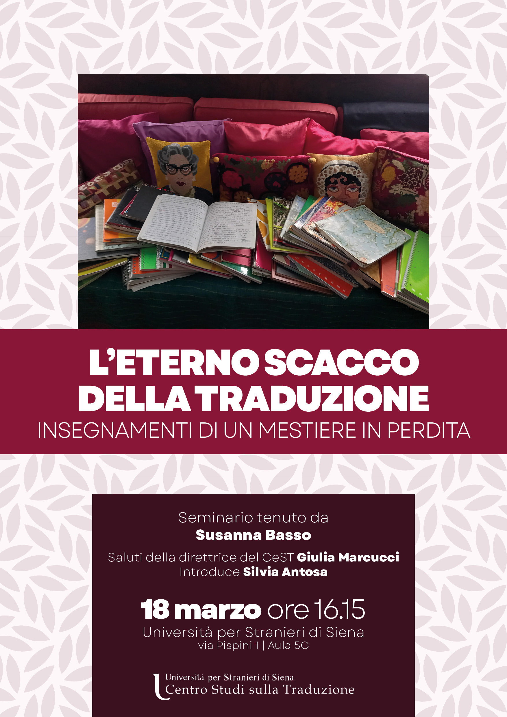 Il seminario di Susanna Basso coniugherà riflessione e pratica traduttive nell’intento di ragionare su quel che la traduttrice definisce “l’eterno scacco della traduzione”, attingendo alla sua vasta ed eterogenea esperienza di traduzione letteraria dall’inglese. Susanna Basso traduce dall’inglese. Ha vinto numerosi premi, ultimo dei quali il Premio Pavese sezione Traduzione 2019. Ha pubblicato il saggio Sul tradurre. Esperienze e divagazioni militanti (Bruno Mondadori 2010). Fra gli autori da lei tradotti, Ian McEwan, Alice Munro, Kazuo Ishiguro, Julian Barnes, Elizabeth Strout, Martin Amis e Jane Austen, di cui ha in corso di traduzione l’opera completa. Saluto della direttrice del CeST Giulia Marcucci Introduce Silvia Antosa. Il seminario si svolge in Aula 5C di via Pispini 1
