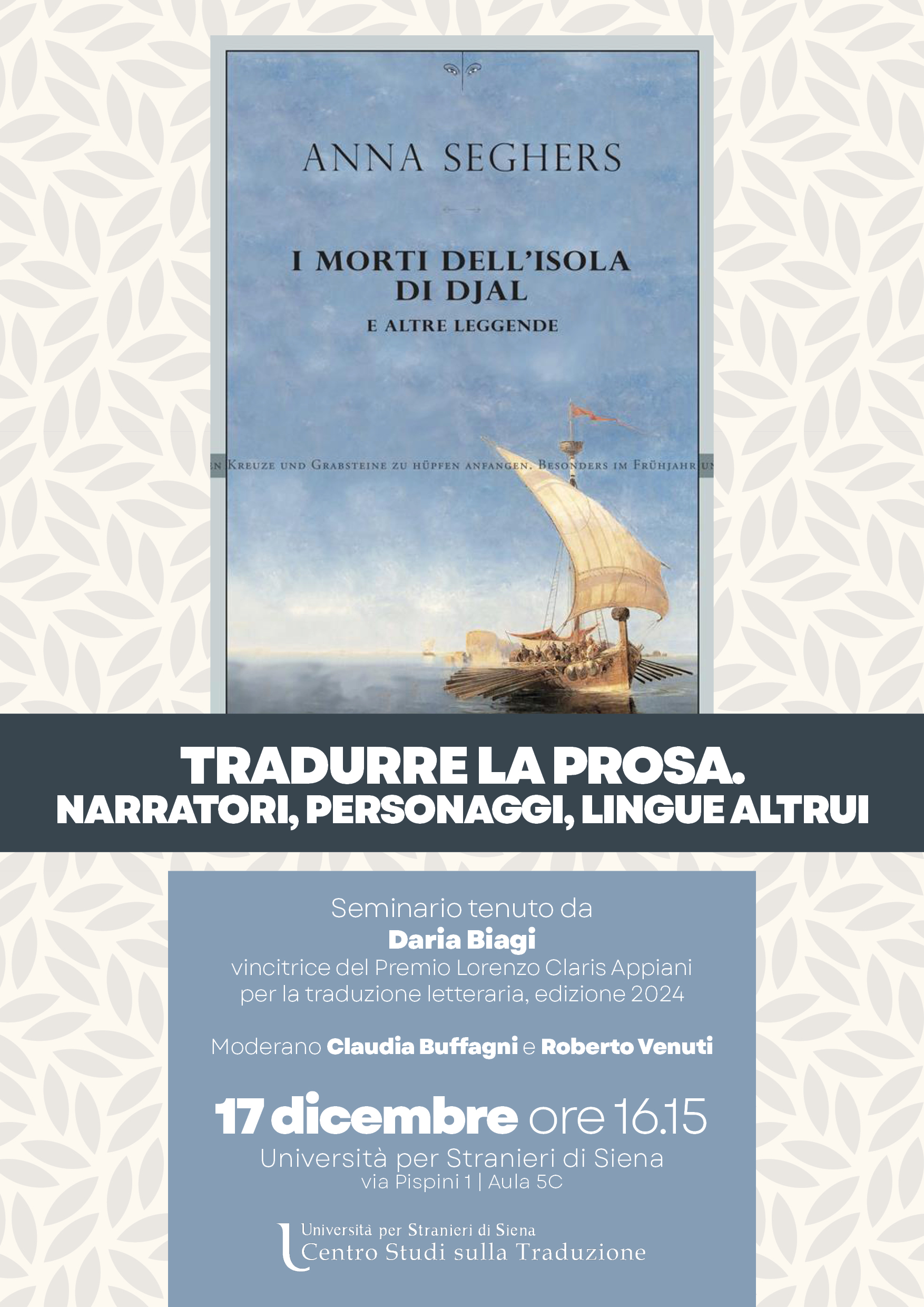 Nel 2024 il premio “Loris Claris Appiani” è stato assegnato a Daria Biagi per la sua traduzione dal tedesco della raccolta di Anna Seghers I morti dell’isola di Djal e altre leggende, pubblicata dalla casa editrice L’Orma (2022). Daria Biagi racconterà la sfida presentata dalla traduzione di una raccolta che presenta testi narrativi composti nell’arco di un quarantennio ed estremamente variegati per genere, temi e stile. In dialogo con Claudia Buffagni e Roberto Venuti affronterà anche tematiche più generali legate alla teoria e alla prassi della traduzione, in particolare della prosa. Moderano Claudia Buffagni e Roberto Venuti. Il seminario si svolge in Aula 5C di via Pispini 1. Daria Biagi si è formata nelle università di Bologna e Francoforte e ha svolto attività di ricerca presso la Sapienza di Roma, l’università di Padova e la Freie Universität di Berlino, contribuendo in particolare al progetto LT.it – Letteratura tradotta in Italia. È autrice di un saggio sull’opera di Stefano D’Arrigo e di uno studio sul romanzo tedesco in Italia (Prosaici e moderni, 2022), e ha tradotto romanzi e racconti di Terézia Mora, Anna Seghers, Jörg Fauser, Franz Kafka. Nel 2018 ha ricevuto il Premio esordienti Italo-Tedesco per la traduzione letteraria e nel 2024 il Premio Lorenzo Claris-Appiani. Immagine: Copertina di: Anna Seghers, I morti dell’isola di Djal e altre leggende.