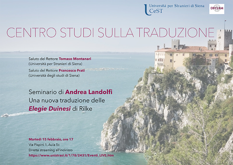 Saluto del Rettore Tomaso Montanari (Università per Stranieri di Siena) Saluto del Rettore Francesco Frati (Università degli studi di Siena) Seminario di Andrea Landolfi dal titolo Una nuova traduzione delle Elegie Duinesi di Rilke Via Pispini 1, aula 5c.